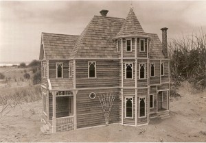 We were just finishing our first house with a tower on it, The Columbia, covered in naturally weathered shingles hand cut from wood we had scrounged in an empty lot, and finished with the white gingerbread trim found on many of the houses near where we lived. The tower was a little weird, but not bad for a first attempt. We called the style Victorian, because the houses we designed them after were built at that time, but they leaned heavily toward Carpenter Gothic–houses designed and built by local carpenter/architects for summer people. The Columbia was the best example of our work to date, and we thought it would make a good introduction piece at the show.