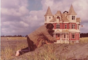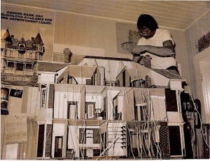 Between November 1977 and Nov 1978 we would produce three more houses, this time on commission. When we returned from the NAME show in early November we had two years worth of orders, but only a little money, so we went to the bank to take out our first loan. Naïve as I was, I was thrilled that they were so willing to loan me the $1000.00 it would take to get us through to our customer’s next payment. Biding time at the loan desk we stared at a poster for home improvement loans, featuring an unusual Victorian house with twin towers and a third floor center cupola. Our little lightbulbs flashed on, as simultaneously we decided that house would be our next mini production. The ad campaign was over, so the bank gave us the poster (you can see it in on the wall behind Noel wiring the house in our studio in the photo below). Months later we would discover the photo was a concoction of the advertising agency—the original house had one tower and a cupola, and the art director made a mirror image of the one side, flipped it, et voila! a house with twin towers.