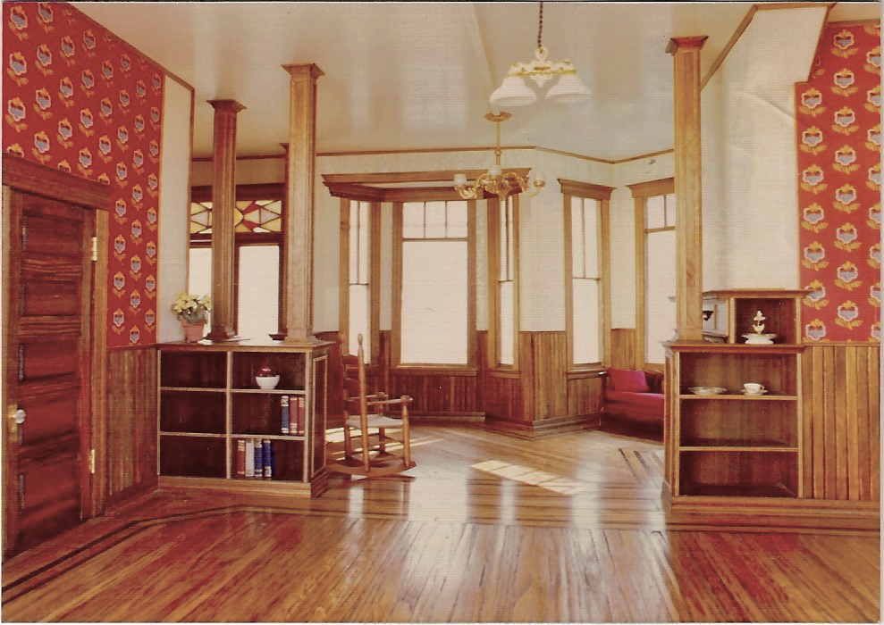 Once all the lights were working, we called the client to arrange for a delivery date. The buyer indicated on the phone that there might be a problem getting it into her house, but that she’d “arrange for maybe a crane, or something.” Sure enough, it wasn’t going through the narrow entryway, so we drove around back and parked at the bottom of an ivy-covered hill below her patio door. She had some burly men on hand, and together we negotiated it up through the ivy (all the while I’m thinking snakes live in ivy), over her railing and in through the door, but then where? The only space large enough was her coffee table in the center of the living room, surrounded at fairly close range by a couch and a couple of chairs, and that’s where she wanted it. The house, at close to 5 ft. tall, 30 in. w X 4ft. l, ate all the space in the room. We sat down and had some iced tea, bumping our knees on the house as we tried talking around it. The customer was thrilled, and allowed as how her friends and family wouldn’t be much fun if they couldn’t enjoy the house when they came calling.
