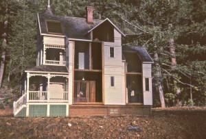 The South Bend miniature house has a two-part story, beginning with its initial construction in the fall of ’77, and its re-hab in 2005 for a new owner. In both cases it has found a happy home—first in California, and now at The Kentucky Gateway Museum Center in Maysville, KY. We worked long hours between August and November to make a timely delivery to its owner in So. California. Part of the rush was to exhibit it at another NAME miniature show, as we had discovered that was our best way of getting new orders, plus we enjoyed the feedback after the solitary months of bringing a project to life. Normally when we finished a house we corralled some friends to help take it out to the beach for a photo session, but the deadline and a spate of bad weather quashed that idea. Instead we packed the house in the van and headed south along the Oregon coast, hoping to find a likely spot for shooting, but again the November rains worked against us. We pushed through to Weed, CA for the night. Weed is an old lumber town high in the mountains near Mt. Shasta, a place Noel wanted to see because it was one of his dad’s regular stops when he traveled for Long Bell Lumber.