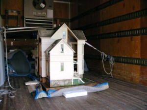 The South Bend has had more than its share of moves. In 1977 we moved it from Seaview to its home of 28 years in So. California, down the coast and over the mountains in our van, and no, we did not have a barrier between us and the house, should worse have come to worse. To this day I believe the barrier of my worry was far stronger than anything material we could have installed. Once at the destination, the two of us would wrestle the house out of the van and up, down or around whatever path was required. In this case it was a fairly simple path, if a little long, and around a swimming pool. The best part was being able to enjoy the pool, a wonderful meal, and a lovely, warm California night in the customer’s guest quarters.