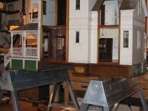 Moving a dollhouse is a dicey undertaking. These cumbersome and unbalanced objects have a way of expanding incrementally and secretly during construction. While we learned early on to design a house narrower than our 28” studio doorway, we didn’t always remember to account for the width of the trims.