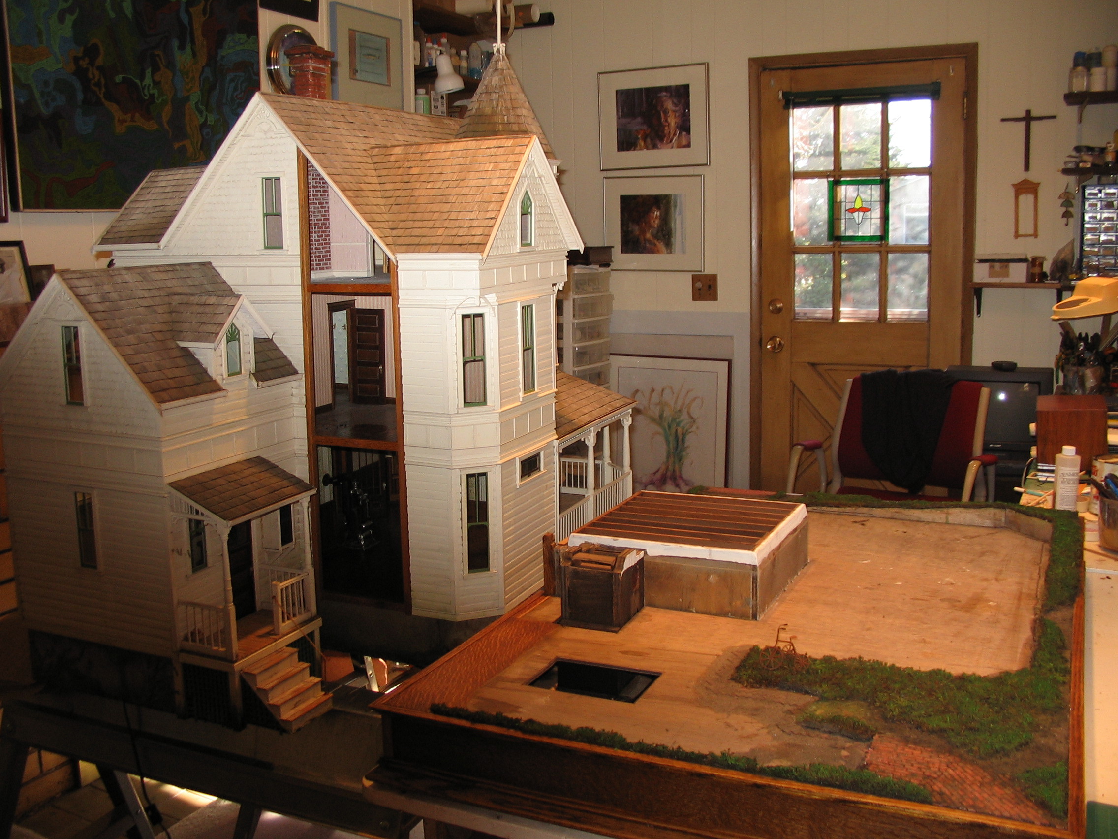 In 2005 The South Bend began its journey from California to its new home at the Museum Center in Maysville, KY, via our current studio in Astoria, OR, and Artech, the art shipper in Seattle. The house had been built before we discovered the fun of mysterious basements and the advantages to having the house on a raised base. Kaye Browning, the customer, asked if we could add these elements. (As a sideline, the previous owner had mentioned that as a child she had been afraid of basements, so we added a lock to the door leading to the then imaginary basement.) Given that we had always loved basements, we jumped at the opportunity to improve upon an earlier piece. It took some doing, but Noel figured out how to install a box room and stairs leading down from the now unlocked door, which would then be housed in a larger, overall base. Besides raising the house for better viewing, adding space for a yard and entry path, the expanded base, finished in oak, aids in the visual transition from miniature house to the full scale table it sits on. The hard part was fitting the puzzle pieces together, as, considering the weight of the house, we couldn’t just keep moving it on and off the base to check. This time there was absolutely no allowance for “incremental and secret” expansion.