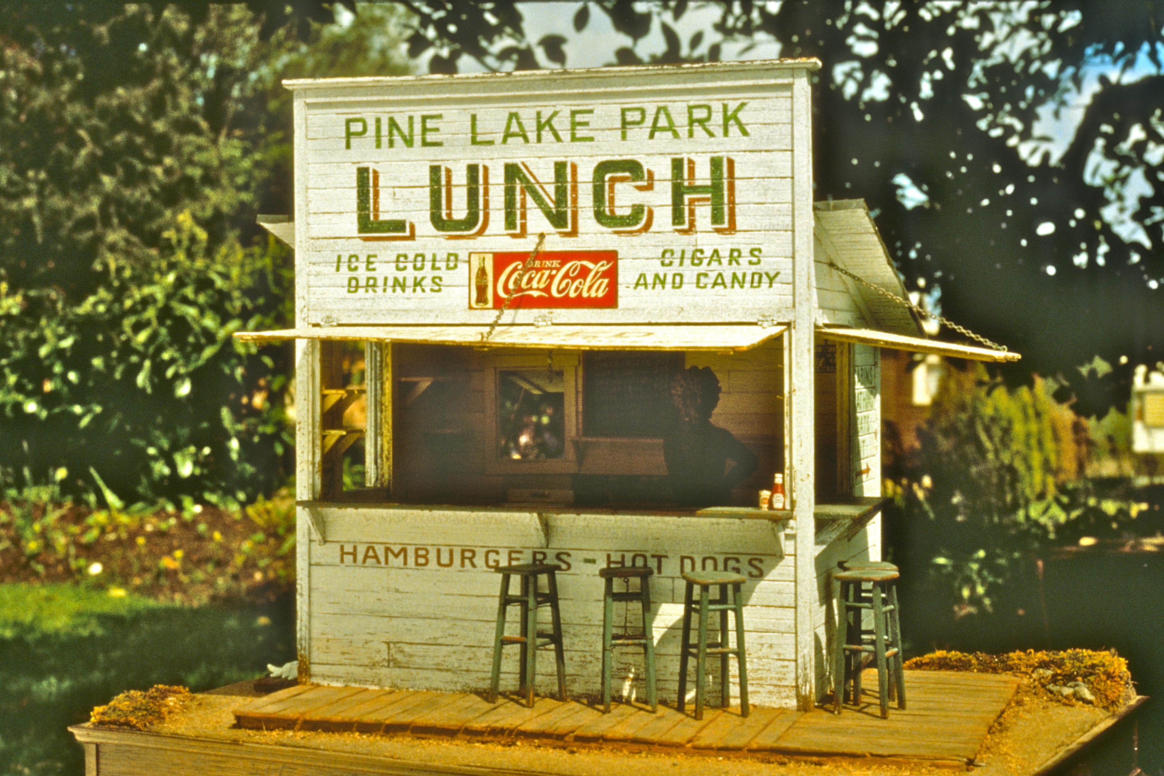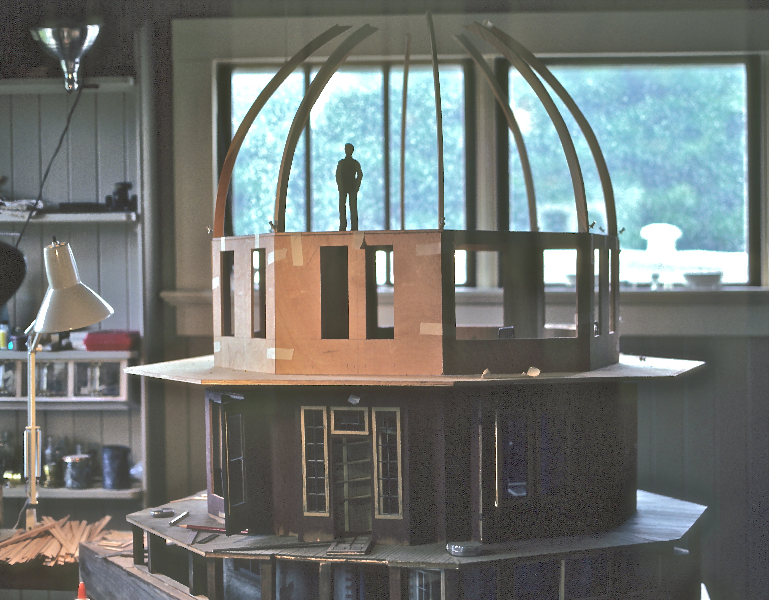 This year, our stand-ins will be making the final journey with us. “Leroy” and “Patty” are a pair of cedar figures that look a little like miniature chainsaw carvings—nothing fancy, but they are design tools we have used for years. It began with Leroy, a hands-in-the pockets kind of guy Noel carved one night to help determine ceiling height in a winding stairwell. Our first photographic record of Leroy is in the Octagon House in 1982. Being proponents of “eyeball geometry,” we needed something to, literally, stand for us in our miniature structures to see if we had good ceiling clearance, or sufficient elbow room in doorways and stairwells, and Leroy was it. If it looked right with Leroy, then we were good to go. Leroy also became the patsy for anything that went wrong—crooked shingles, molding “cut three times and it’s still too short,” glue that refuses to dry. Poor Leroy, we treated him miserably, and he just stood there, the utter stoic. Noel is quite clear on the fact that the figure is Leroy, not Noel, but if you look at two of them together, I think you’ll see a chip off the old block.