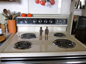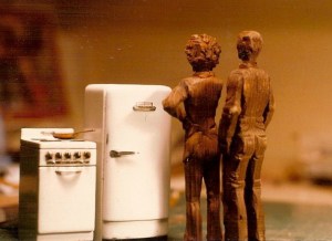 One morning I came down to let out the dog and found a new carving on the table, a female figure standing in one of my characteristic poses, one elbow out, hand on hip. The other arm made me look like I had a stomach ache, or a broken arm, but she had my hair, and was wearing my work apron. Noel said she was “Patty,” so Patty she was, and is–Leroy’s right arm (broken or shriveled as it is) buddy. She has the same weird apple-doll smile as Leroy, maybe from a poor diet and long nights standing up in the dark. They don’t get out much, and it shows. I do think we were kinder to Leroy once Patty came along, she looks like she doesn’t suffer fools gladly.