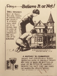 By 1978 we had become local celebrities. To our dismay, shop owners in town would suggest our studio as an attraction for tourists. For the most part these people were only out to gawk, and eat up an hour or more of our precious work time (or worse, our naps!). They thought they had come to see sweet little toymakers, instead they saw something they couldn’t comprehend–it just didn’t fit their expectations. It inevitably came down to the real question, “How much?” the answer to which invariably made them gasp, clutch their purses to their chests, and hurry out the door. The upside was some wonderful publicity from the press, including a lovely article written in The Daily Astorian (OR) by one Nancy Butterfield in 1984, which included a photo of The Oysterville. Unbeknownst to any of us, the photo and a few lines of her copy were picked up by “Ripley’s Believe It or Not.” They decided it was okay to name me Peggy, and their “artist” made a pretty poor line drawing from the photo (I guess to avoid copyright problems…) in which “Peggy” is enormous, and Noel looks about 10 yrs. old. The worst was the obvious incredulity at these people selling dollhouses for  “up to $20,000!”  As far as we know it only ran once, on a child’s page in an Alaska newspaper, but once was enough for some miniaturist to see it and send us a copy. It remains one of our prized possessions.