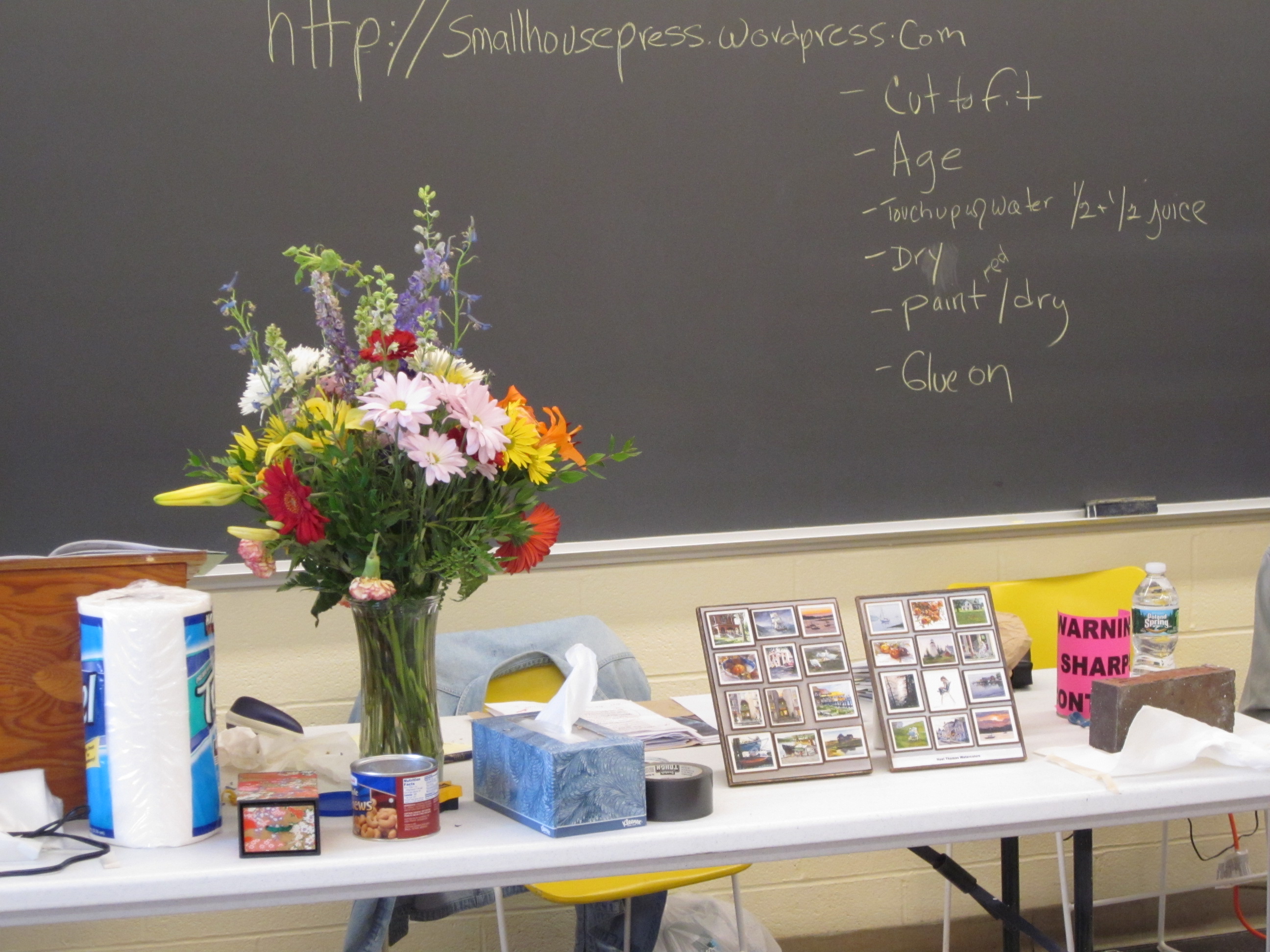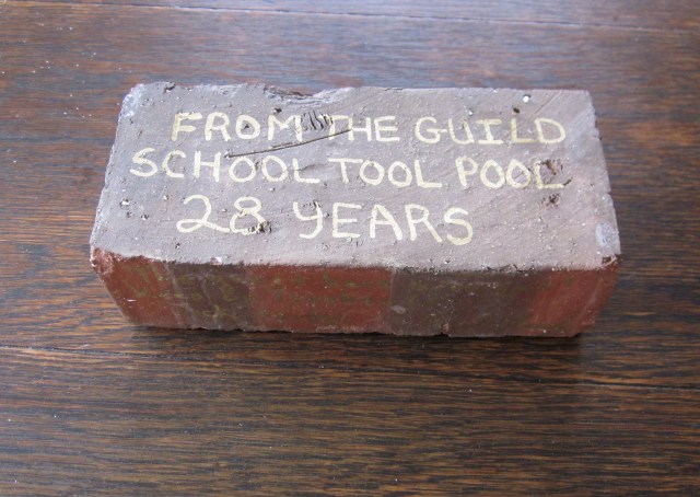 Noel and I just returned from 15 days and our last teach-a-thon at The Guild School in Castine, Me, and our last class ever. The School and Castine were their usual lovely selves and difficult to say goodbye to. I am hoping some of you will email me photos for future postings about the school. We thank everyone in attendance for their good wishes, the wonderful flowers that graced our as-always messy classroom, the keepsake album, and best of all, our very own brick, signed in gold by the ever-ready Tool Pool! Special thanks go to Pete and Pam Boorum for packing and shipping up both the album and The Brick. We are in your debt…