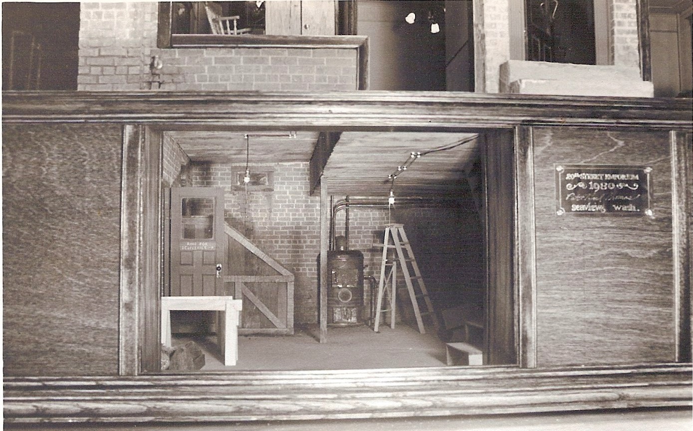 I found this B&W photo of the Emporium basement, taken by the original owners, Mr. Peepers Miniatures in Seattle. Besides all the detail we built into it—furnace, coal bin, tiny window, lighting strung across the ceiling, brick walls, cement floor—it is two other details, provided by the owners, that bring this room to life—the set-up ladder, and the open door. It is no longer a replica room, but a scene from life. Someone has just left the room, we imagine, maybe to find a bulb to replace the one over the ladder. We have been transformed from watchers to participators. We believe. It is that element that kept Noel and me going all those years. The building was just the foundation, so to speak, for creating that feeling of someone just having left the room.