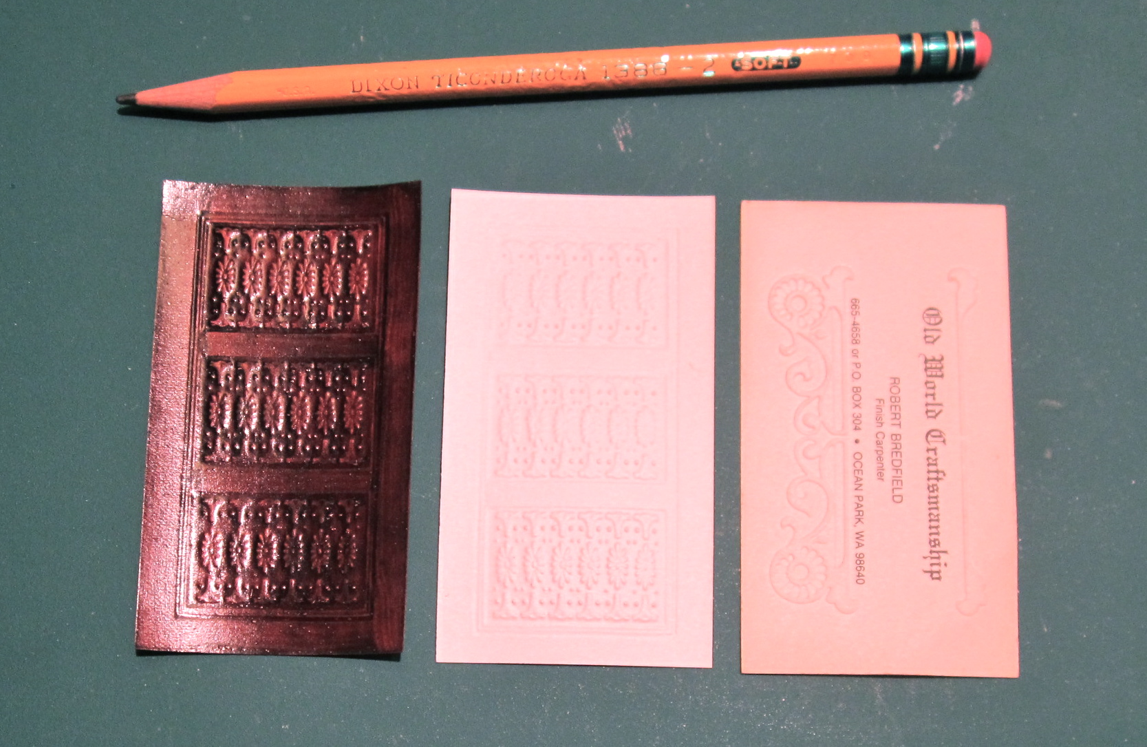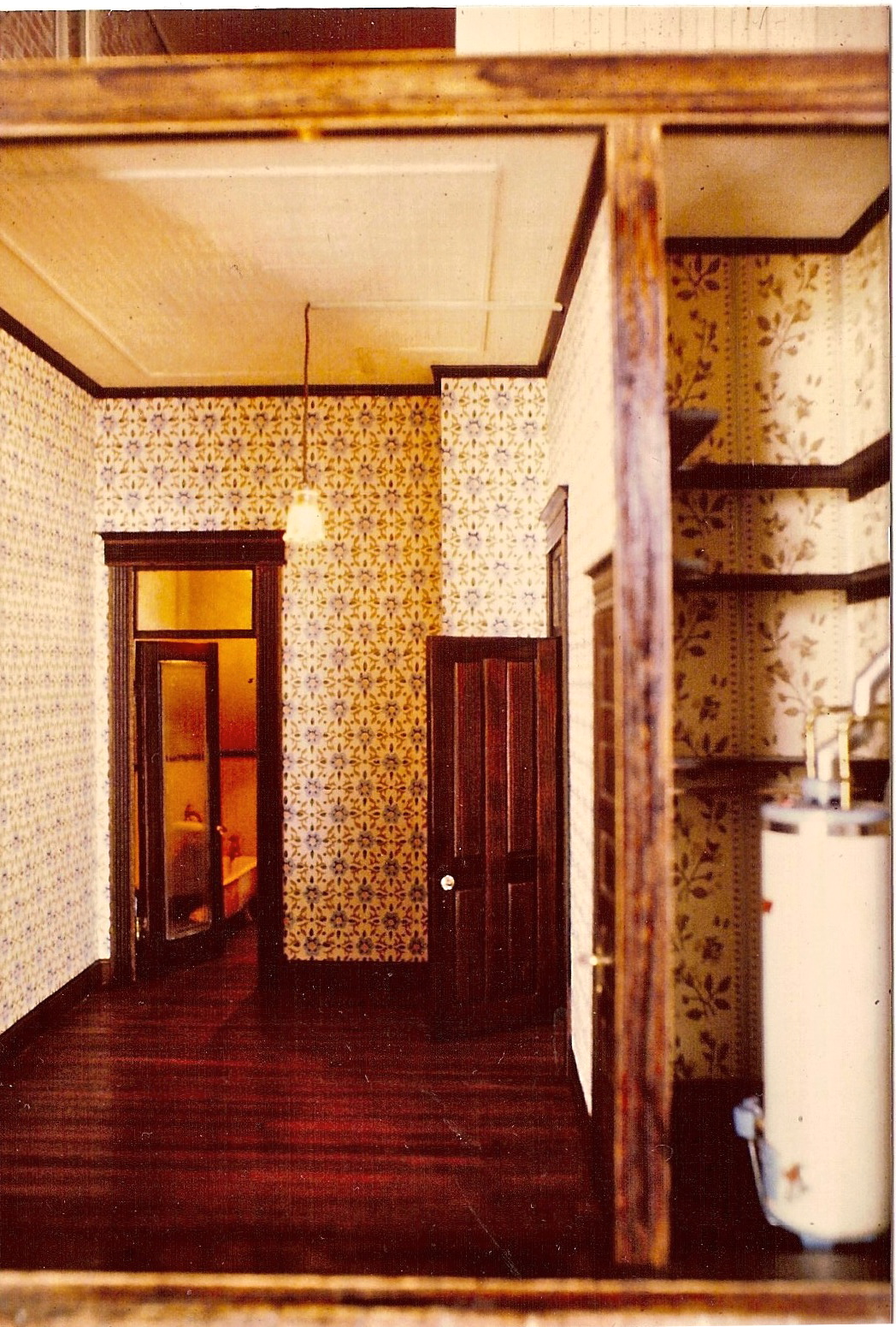 What’s barely discernible in these photos is the pressed tin ceiling, a staple of apartments and commercial buildings of the era. The project involved expanses of ceiling space, so we needed a good solution. In another case of friends helping friends, combined with the Eureka process, we talked over our dilemma with Bob, a contractor friend and aficionado of Victorian detail. His face lit up as he reached into his shirt pocket, pulling out his newly printed business cards. They were embossed with an ornate Victorian gingerbread design. He said all kinds of designs were available at the local printery. This immediately morphed into our finding an embossed design that could be ganged-up on a business-sized card to look like tin ceiling panels. Rick the printer loved the idea (he also printed our miniature newspaper insulation) and helped us find a suitable design. The bas relief was subtle, just enough to translate into the feeling of pressed tin, without drawing too much attention to itself. One sensed it was there, and knew what it represented without thinking about it. An added benefit was that when we glued the “panels” to the ceilings, the card stock warped slightly, just the way the full-size tin panels do. Once they were in place, we painted them off-white, with enough gloss to reflect off the raised portions.