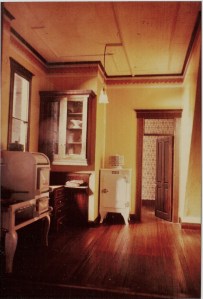 Noel and I have both been apartment dwellers, so the Emporium kitchen reflects everything we wished for in our apartments—an eat-in kitchen, and window over the sink, from which to watch the world while washing the dishes. We sacrificed counter space to make the room for the old fashioned Roper range and fridge then on the market. The cutting board is pulled out, and there’s that tell-tale open door again. How simple it is to capture us, once we want to be caught.