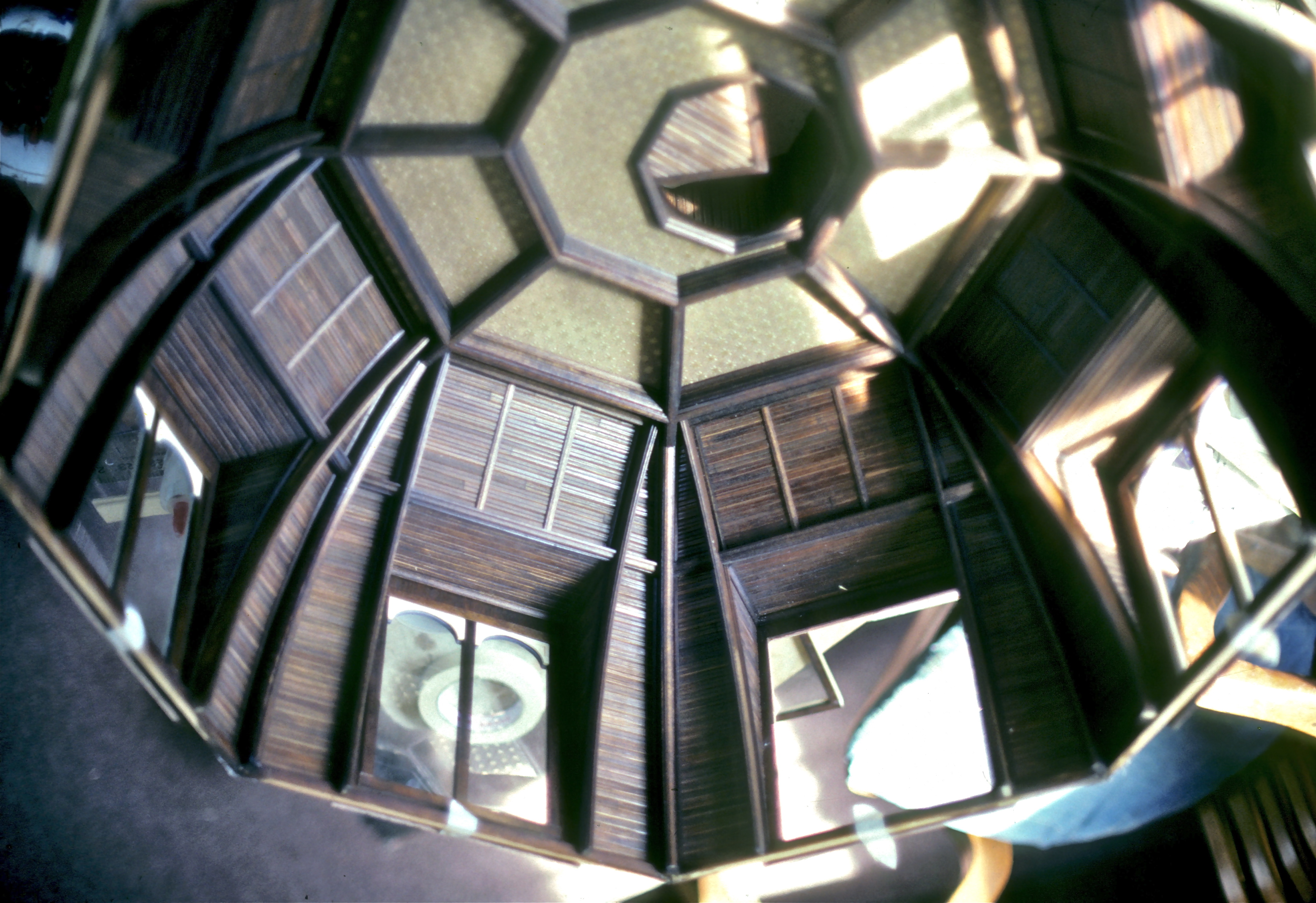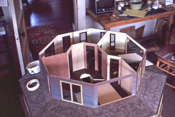 Thanks to one of your comments, dear readers, I combed our slide files and found a paltry handful of Octagon interiors–just glimpses of rooms under construction. The dearth of interior shots is a mystery, as we normally cataloged our work as we went. Obviously the puzzle of this house had us so entwined we forgot to shoot the finished interiors. Noel says it’s because the octagon shape demanded we keep most of the outer walls intact.