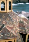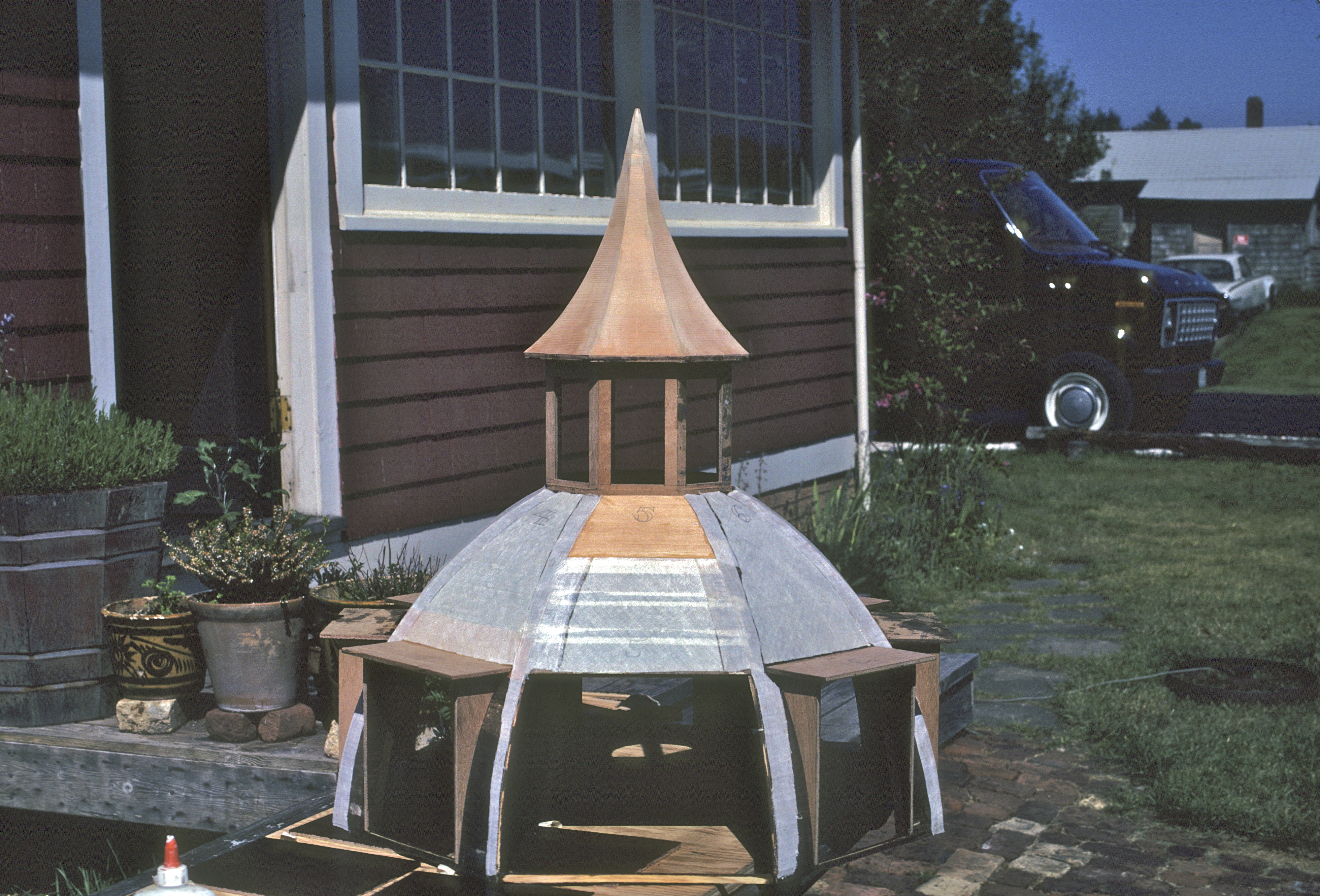 While we papered, paneled and laid flooring in the first and second stories, our minds worked at decoding the mystery of the dome. Not only the actual construction of the dome, but how we would achieve something that looked like the original, intricately-patterned slate roof. We knew slate was out of the question, so we had to recreate that illusion with cedar shingles. Plus, there was the whole wood-paneled interior to make. When the time came we began with what I can only describe as seat-of-the-pants construction.