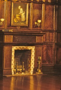 During those years we got in a lot of long evenings of conversation over dinner (many cooked by her husband Norm, who made superb, fresh and off-the-grid Chinese dishes) at her home in Portland, hoping to coax a project out of her. Finally, in early 1982, she asked us to Portland to see her latest creation, a graceful, cranberry glass chandelier, each shade framed in gold filigree, hung from a long brass stem. And she had a box of tiny tiles, each embellished in a cranberry and gold design. She wanted a library room to house her chandelier, with a fireplace bordered in the tiles. She thought some dark wood paneling would be nice, too, but the rest was up to us.