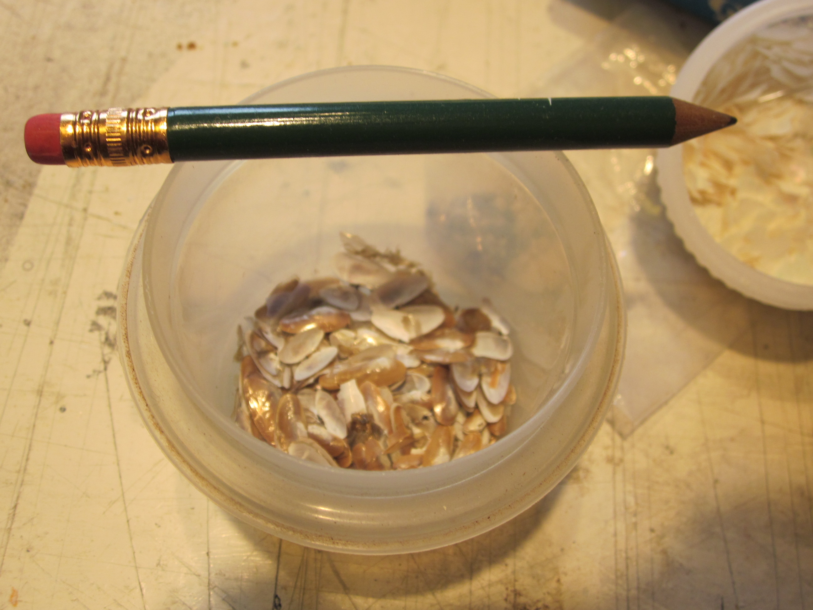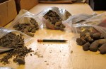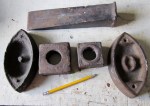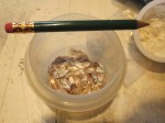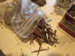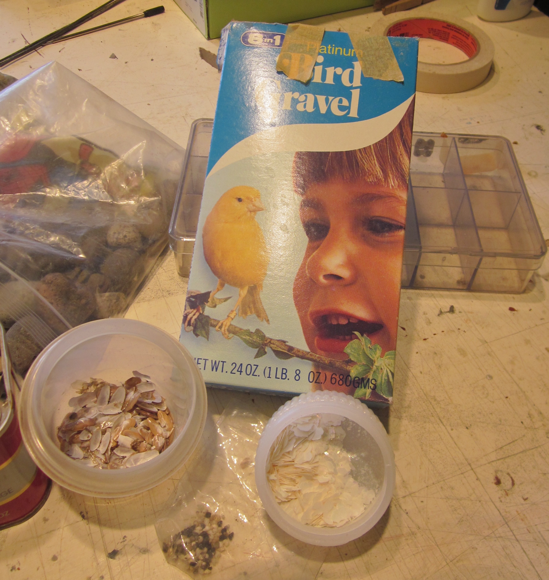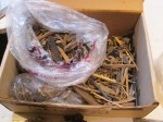 Mini driftwood broken sorted by size, mini stones, gravel and pebbles, beach sand, bird gravel, mini bricks and seashells, 1 coffee tin beer pull tabs, rusty metal, rust dust, real-world-sized rusted wood–splitting wedge, railroad spikes and flatirons, baby bird head-feathers (don’t ask), cigarette ashes, dental drill bits, horseshoe nails, dried creeping thyme, 4 lbs. of brass pins a millimeter too thick for sewing, and copper screen sections too small to be useful.