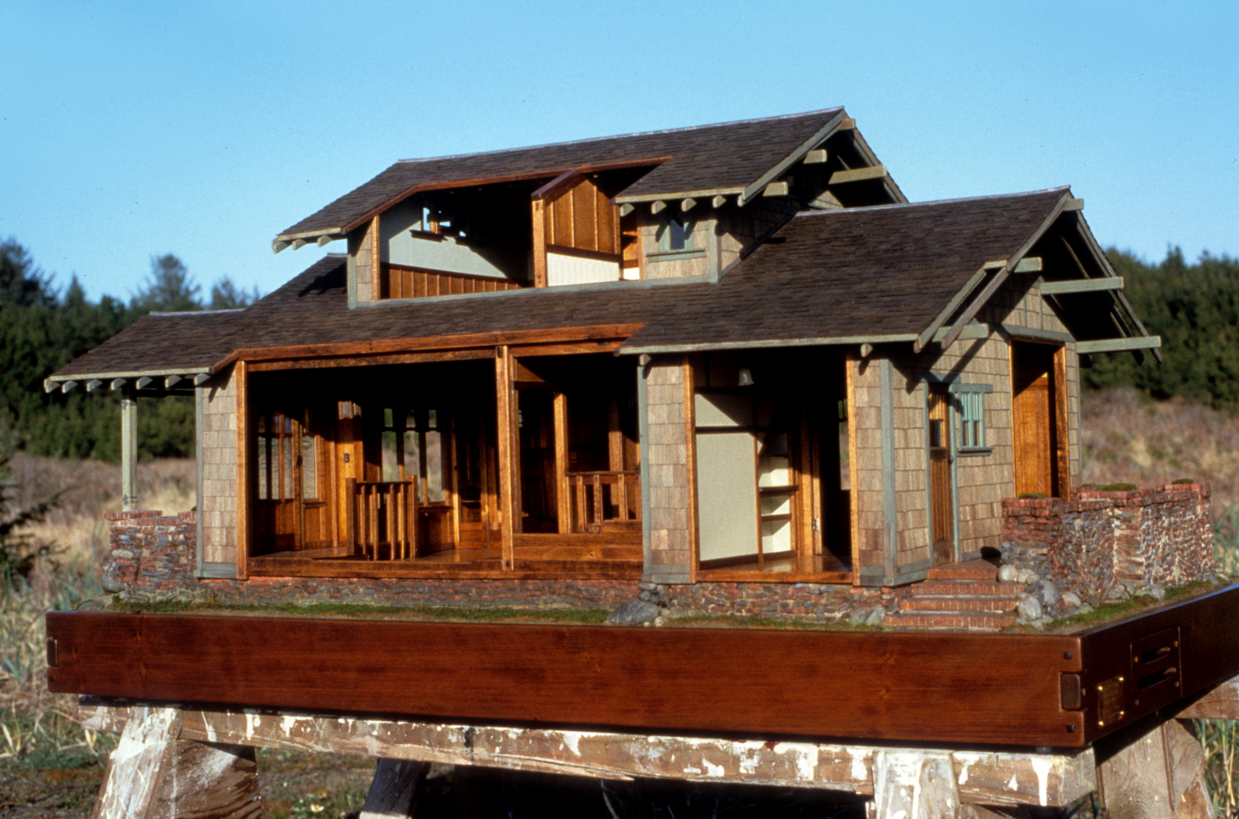 Somewhere in the late 70s we ran across a copy of American Bungalow magazine. Inside its covers lurked photos of the Craftsman bungalows of Pasadena, CA designed by Charles & Henry Greene. One look and we were smitten, or more like bitten by the bungalow bug. And the bite was deep. After all those Victorians we’d built, the bungalow looked like a breath of fresh air—the deep overhangs, the harmonic horizontal lines, the play of light and glow of the interior spaces, the exposed woodwork. The bungalow vampire–instead of sucking the lifeblood out of us–re-charged our juices for continuing to build miniatures.
