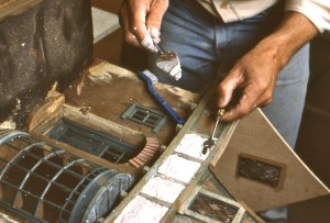 Noel remembers it was hard wood, and required a lot of wire-brushing and end-aging with an Exacto. It looks old to me, even before the Bug Juice, like something we scavenged. The “daub” was Plaster of Paris, with probably a little Acryl 60 cement adhesive added (a product which holds the plaster together, and to the wood, preventing chipping or powdering down the line).