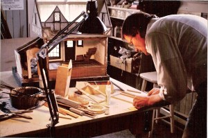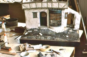 Jack Blackham custom cut the roof slates, each one with beautiful crisp edges I subsequently rounded and aged with needle-nose pliers. Because Noel designed-in an alleyway with diminishing perspective, I had to come up with cobblestones in ever-decreasing sizes. I think it was Mini Brick & Stone who made the bricks of a plaster-like material, tons of which I soaked in water and carved to the size and shape I needed.