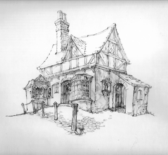 The timing of Pippen Hill was perfect—building a fantasy toymaker’s shop after months of  working under the thumbs of Charles & Henry Greene’s exacting standards.  It felt the way a horse must feel running free of saddle and bit–not a straight path to be seen. We were also free to come up with all the materials we’d never worked with before or knew where to find—wattle and daub, cobblestones for the terrain (great texture, as Pieck so wonderfully illustrated) and a slate roof. But that could be dealt with later, first Noel got to play with design. He came up with a relatively small project (26”wide X 19” deep) that included an alleyway, bow window, cobblestone street-front, and a portable puppet theater (to take to the park a la a Punch and Judy Show).