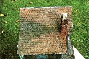 Aged roof detailRegrettably, the roof always came at the end of the week, giving students minimal time to learn shingling and aging. After applying the shingles we wire-brushed them, and then went back with Exactos and needle-nose pliers to make them look weathered and in need of repair. The final step was painting in the moss (sap green transparent watercolor, dirt and rot (thin dirty water washes of raw umber, black acrylics) and some sienna for rust. That big dark spot we imagined had been shaded for years by a big evergreen. The flashing at the top was made from strips of rolled-out wine bottle lead, from the days before they decided it was unhealthy. No, there wasn’t time to drink all that wine–we had an “in” with the local fine dining establishment.