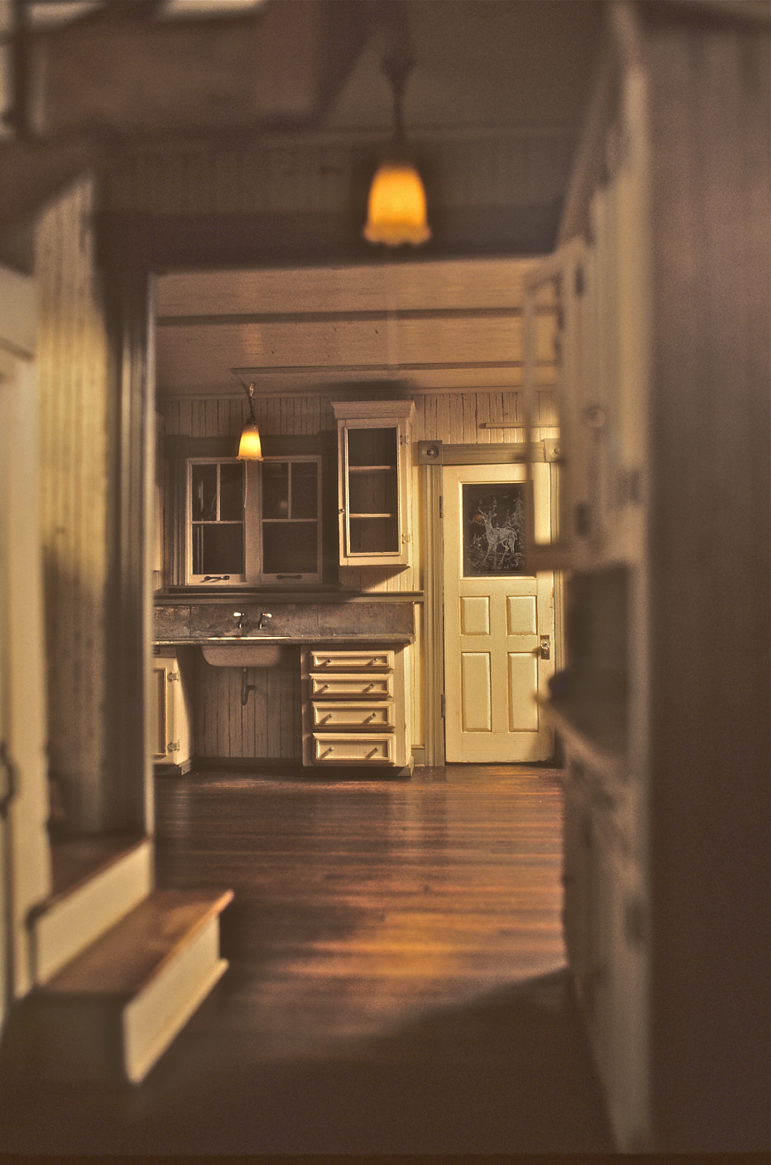 But there is the good part–the payoff for building a fragment is that you get to put a few evocative rooms into a small structure. For me, this Reader’s Digest version of a dollhouse is much more intimate than a larger structure. In this case the fragment was a large kitchen, butler’s pantry, with a winding staircase, leading to an attic room/maid’s quarters and tiny bath above. Functional, but reminiscent of kitchens past, cooking, and family gatherings. Your mind can get lost in it. Much of the design stemmed from a similar setup in my grandmother’s house—something I must have nudged forward unconsciously, or not. I remember being thrilled to reach an age where I got to spend the night in that tiny room over the kitchen.
