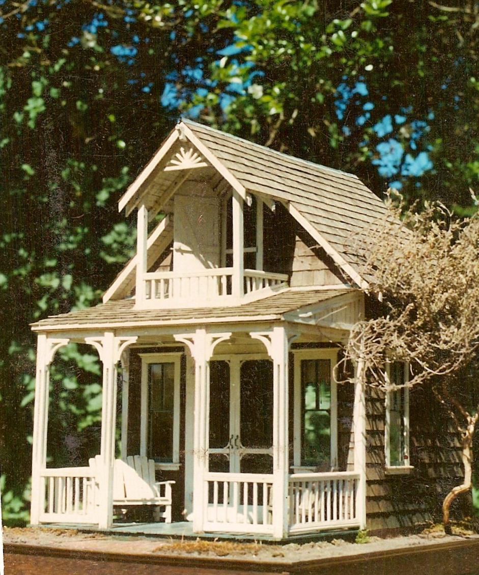 The design of our Summer House is, as always, eclectic. Its shape and basic proportions derive from the camp houses, which traditionally measured just 11’4” wide X 19 ½” deep. Because of their proximity to neighboring houses, their white-painted gingerbread trims were predominantly on the front, making them perfect for a miniature project. But then we deviated. Where the Oak Grove houses had open balconies on the second floor, ours was roofed, inspired by a beach cottage near our home on the Washington coast. Local architecture also provided the models for the Carpenter Gothic trim in the front eave, as opposed to the ornate curlicues of the camp houses–a nod to simplicity. And, Noel made the upper half-story of ours shorter, to work better as a class project, as well as fit in our shipping boxes.