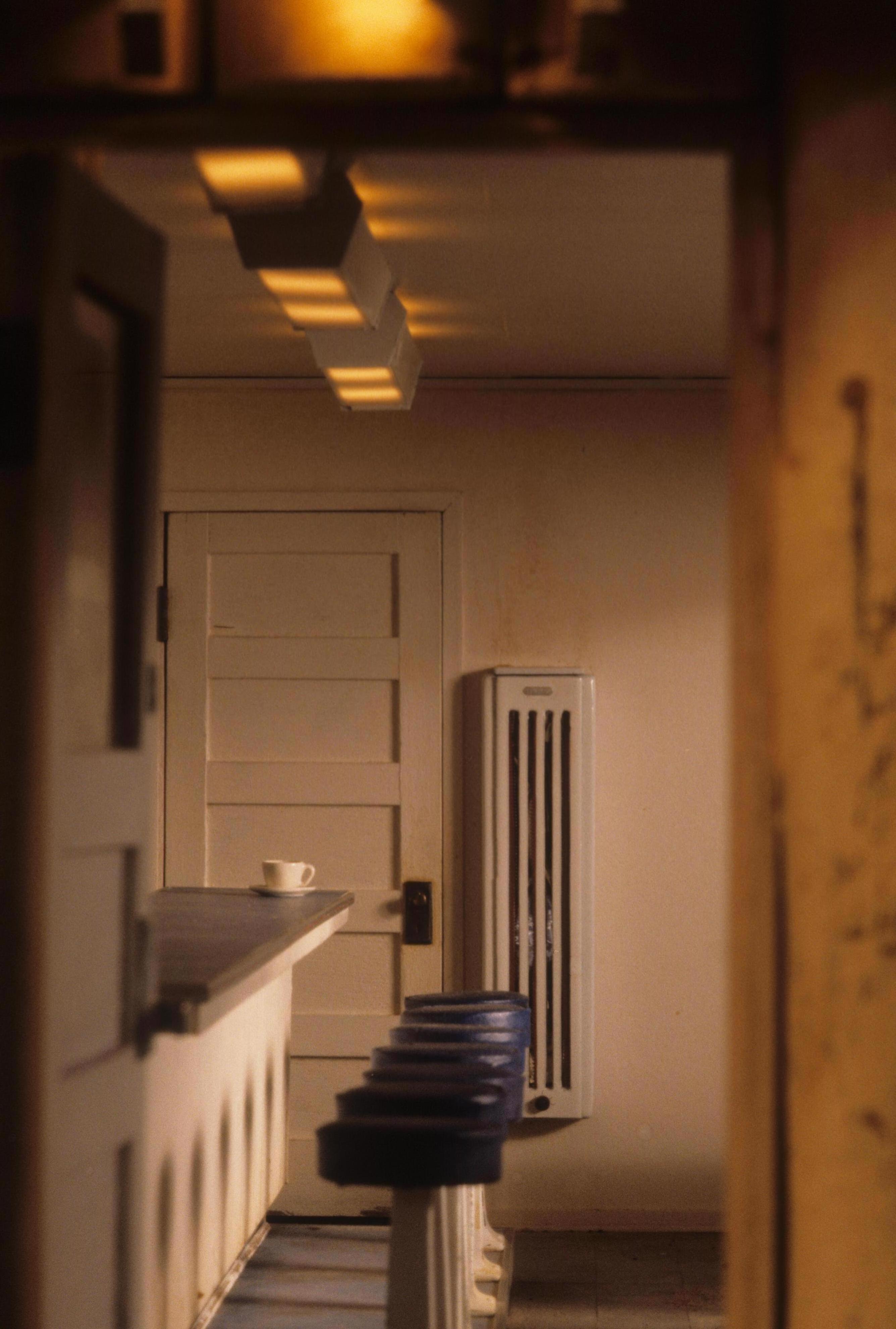 Noel’s art director’s eye picked up on the utilitarian black electrical outlets lining the cream-colored walls—one of those little visual tricks to suck you into believing this is all real. Part of it was remembering how the light switches in the Greene & Greene house had subtly brought the rooms alive, though probably few recall seeing them. He made the outlet plates from thin black plastic sheeting. The plug receptacles were then indented into the plastic with a nail set, and the plug holes made with the tip of an Exacto blade. The plug itself was made with a small wooden bead, cut in half, painted black, and glued to the receptacle. The cord was a length of miniature electrical wire—one end glued into the hole of the “plug”, and the other end into the appliance. And each of the appliances—the malt blenders, toaster, coffee warmer, etc–would have black cords leading to the outlets. The mind could believe an appliance worked if it was plugged in.