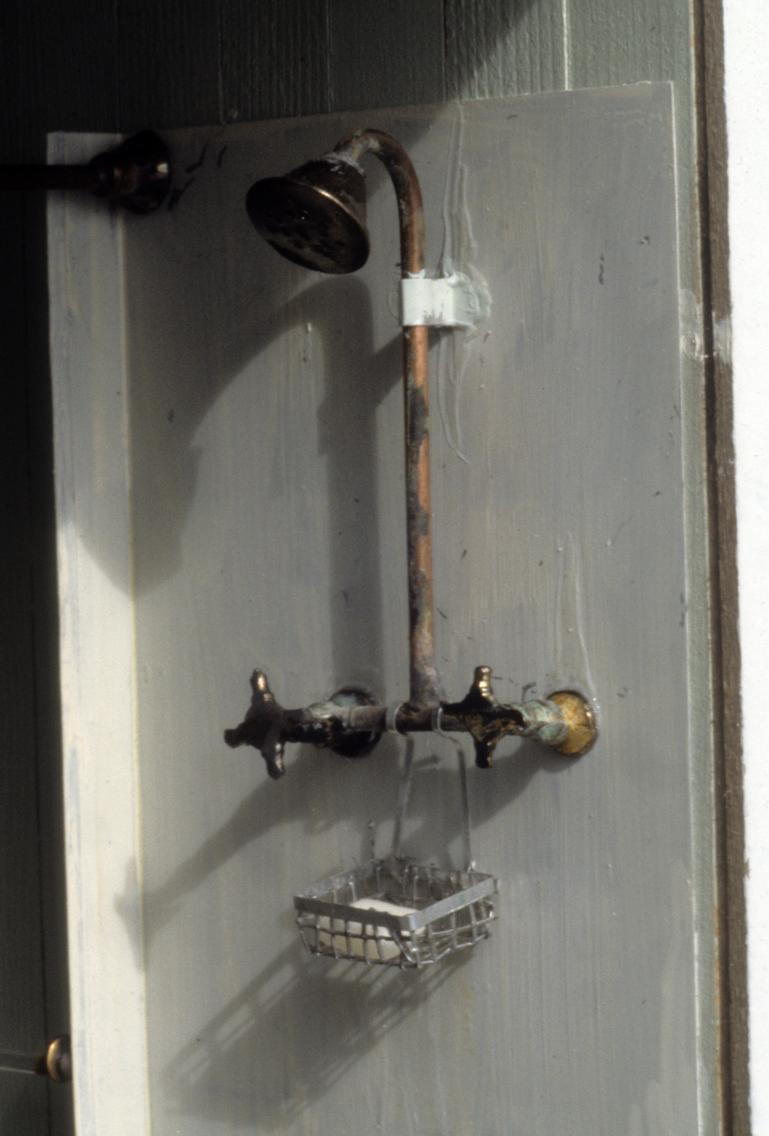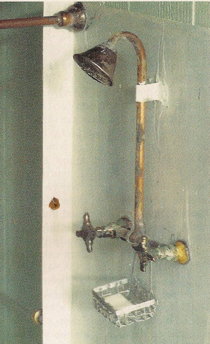 Scan 6  Another delving in our Salvage Department resulted in the shower plumbing. The water pipes, leading from the wall to shower head, are made from 1/16” copper tubing. Run a length of wire in the tubing before you bend it to prevent crimping. Noel the soldered the tubing into the upside-down T shape with the cross of the T leading to the hot and cold faucets. The length led up to the shower head. He then bent the curve into the “pipe.” The shower head is a bell-shaped brass ceiling cap left over from a Lighting Bug light fixture. The cap is filled with lead solder, and the spray holes drilled with a manual drill press. The solder was then aged with Caming Darkener (stained glass supply), and the rest of the metal with Brass Black.