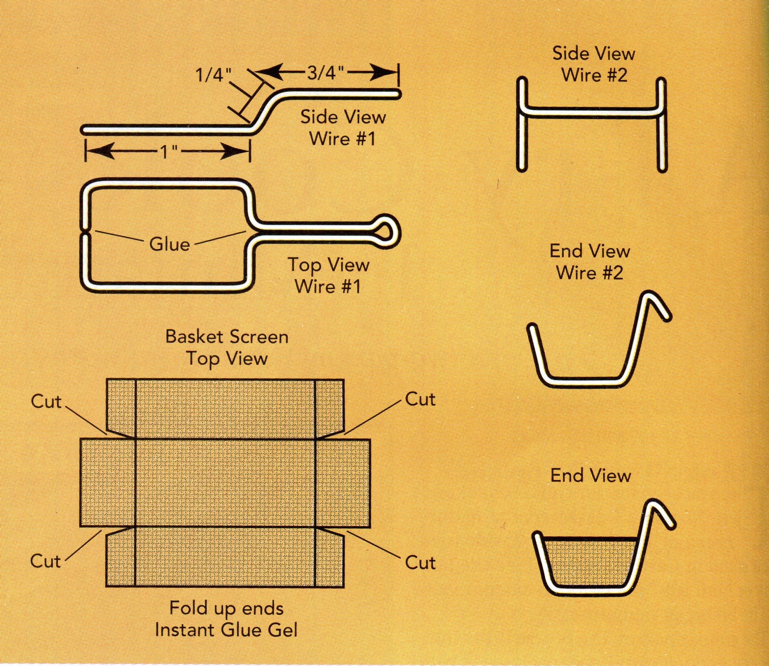 The fryer baskets take some practice. Make the framing from two pieces of aluminum wire, the same kind used for the door handles. Referring to the photos and diagrams, cut and fold a paper pattern to determine the basket size: smaller than the fryer box interior, and with room for a comfortable space between the two. Also, the bottom of the basket should be narrower than the top. For ours, Noel shaped the basket around a section of ½” sq. basswood, standing it on end to form the lower corners and the width of the basket bottom.