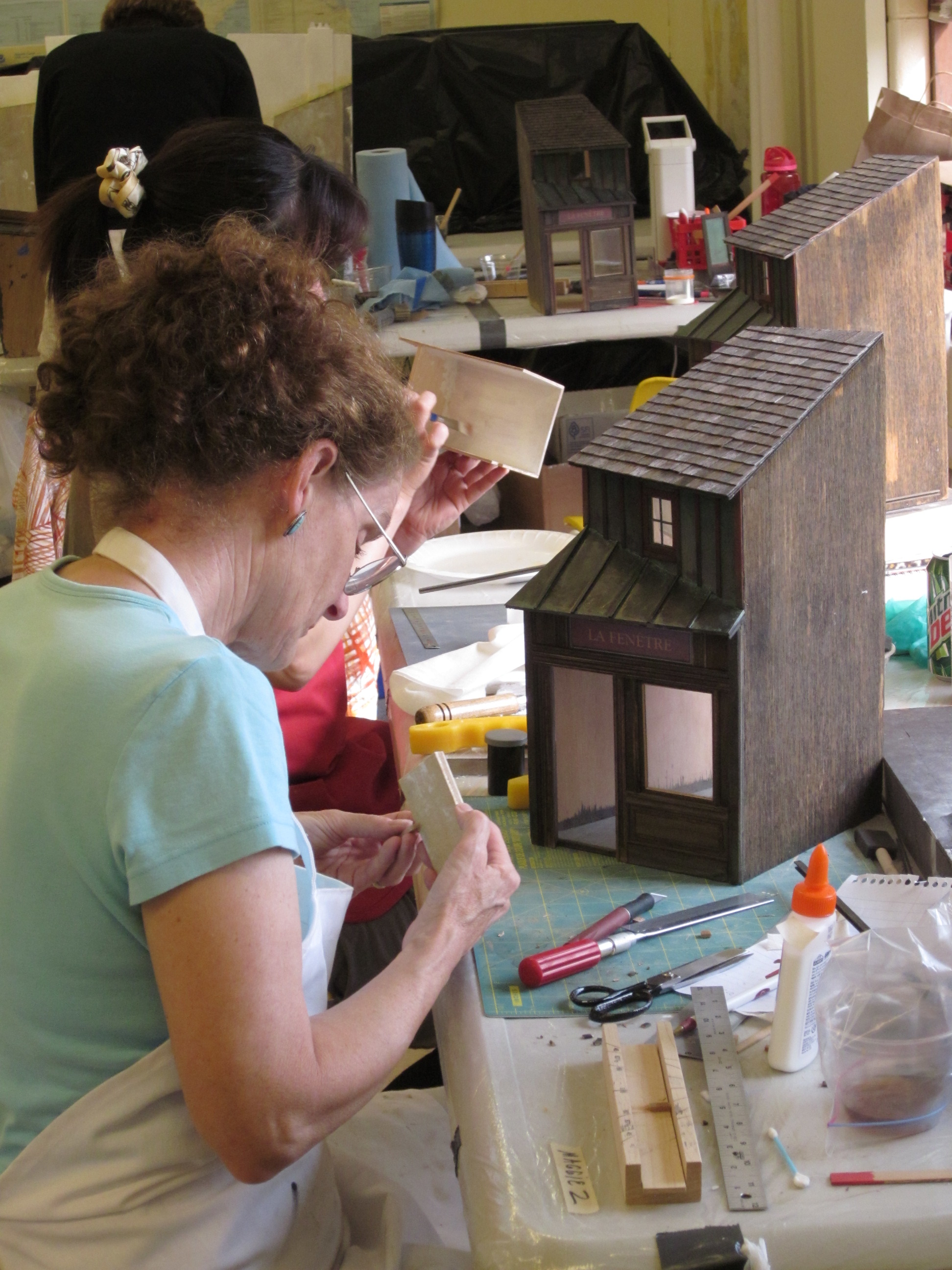 Maggie Zimmerman has finished both roof sections. The tall side walls of the flanking buildings were not attached until the project was done and ready to be set in place. It also made them easier to ship.
