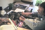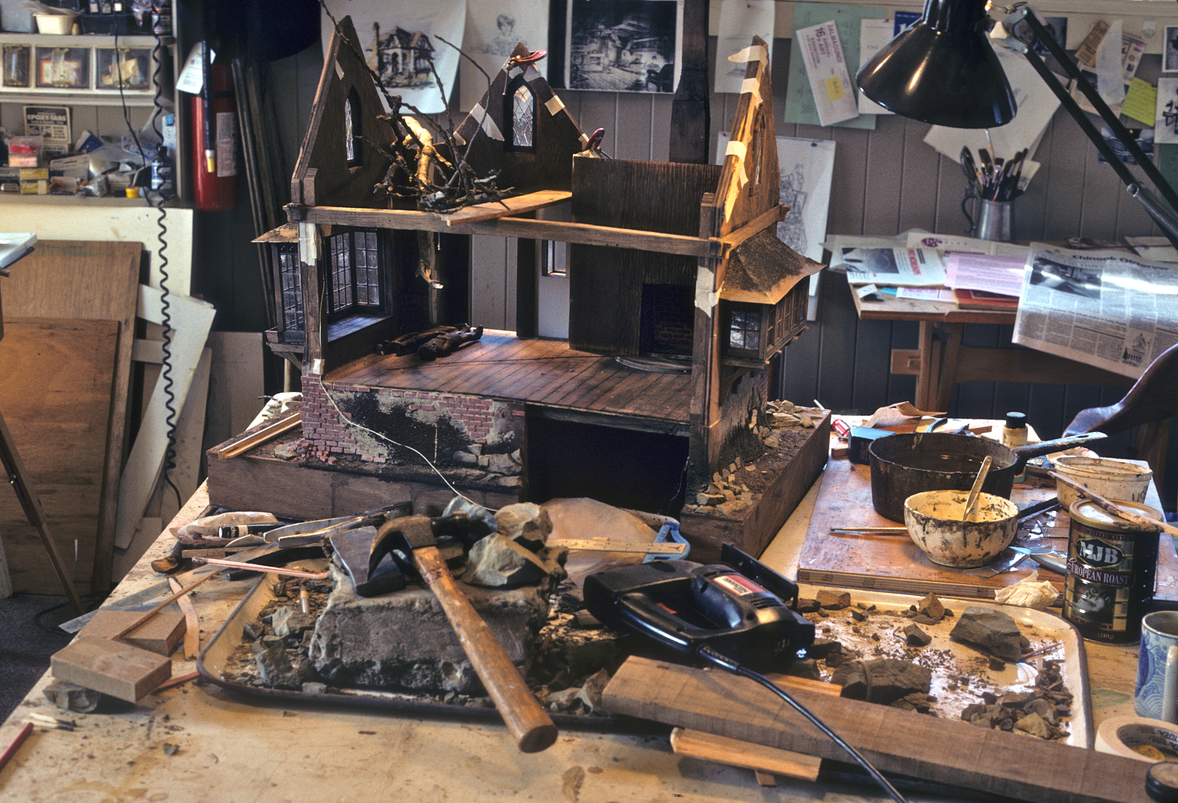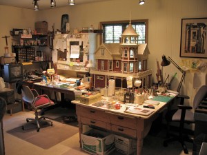 Late nights after we finished work, Noel often stayed up and just looked at the house, waiting for new ideas. One of those brainchilds came from noticing a hatch of baby spiders on our front porch, which he moved to the attic of the miniature house, then closed the door to the studio and came to bed. The next morning I opened the door to find the entire studio webbed–little white threads connecting the house to the ceiling, worktables, spare wood strips, tools and bottles of glue—everything linked to the next. And yes, the attic had tiny, in-scale webs strung across its ceiling.