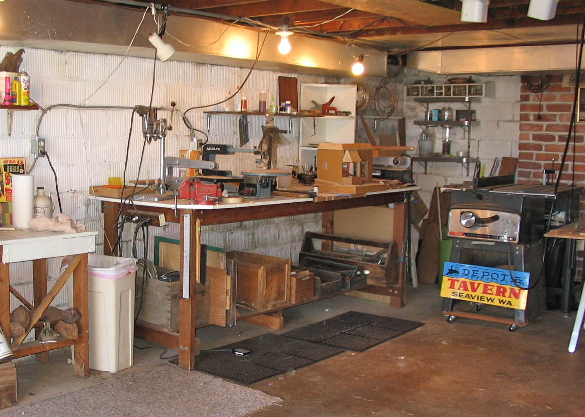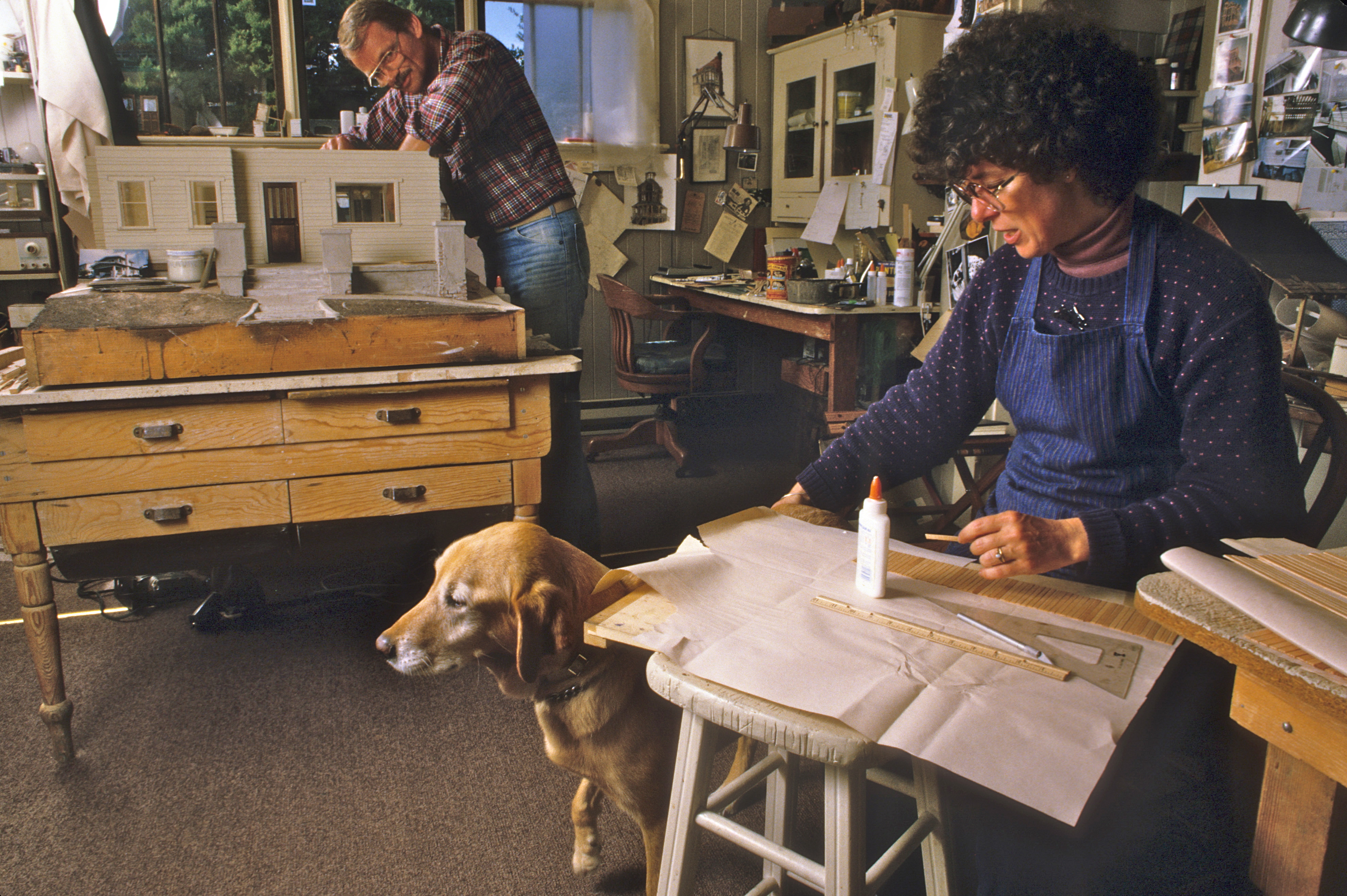 The North Head was destined for Hawaii, and our enthusiastic client plied us with packets of chocolate macadamias and Kona coffee via the post office. We experimented more with aging details—breaking out some of the lattice under the house (where the dog went for shade), more wear and tear on steps and staircases, and a few more stains under the window ledges. While we were known for our aging techniques, it would be a while before customers would encourage us to do more. Noel developed his black wax formula for floors—Johnson’s paste wax mixed with cigarette ashes (yes, it smelled awful–eventually we replaced the ashes with Mars Black tube acrylic paint). It was applied after the floors were stained and laid, hand-rubbed in with a darker build-up left in the corners. It was one of those largely unnoticeable details that made a room feel real. It seemed to register in the sub-conscious of the viewer as evidence of human occupation. For us it took “the new” out. We added glass etching to our repertoire, which allowed us to embellish the houses even more—by then we were totally immersed in Victorian ornamentation. Jim Marcus introduced us to the wonderful gelutong, a dense wood, similar to basswood, but with almost no grain that allowed Noel to cut intricate gingerbread shapes on the scroll saw with minimal breakage. One of my favorite elements was the glassed-in back porch off the kitchen, very close to the sunporch on the front of our own house, where we ate dinner during the summer.
